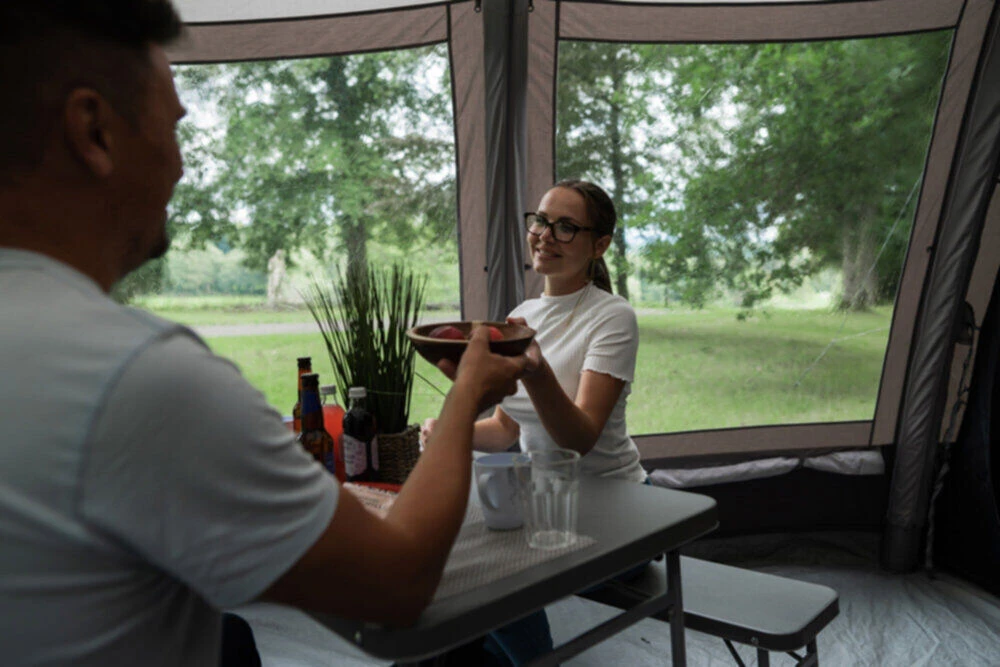 | Features | Clear Visibility Guylines to reduce tripping hazards Pre-attached canopy to front, which can be fully enclosed. Airspeed Value for easier inflation and deflation. Drop-down doors to front and side. Toggled Privacy curtains on the windows on the inside of the living space. Airzone Panel increases airflow throughout the tent. Nightfall bedrooms offer a darker sleeping space. Waterproof, sewn-in groundsheet for the living space. Diamond Clear Windows Bedroom Pockets Toggled Inner Dividers for versatile bedroom layouts. Clear Access to Bedrooms, prevent tripping hazards in the sleeping spaces. Tension Band System II – for bracing the tent in windier conditions. King Pole Side Door, king poles are sold separately. Lantern Hanging Points Mesh Flysheet doors and internal windows promote ventilation throughout the tent. Villa Construction Airbeams offer greater internal height to the tent. Pre-angled beams for greater standing height inside the tent. Double living space Airbeam pump included Smart Pack Bag helps the packing away process. Groundsheet protector included with the tent. |